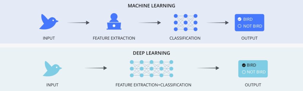 Unlike traditional ML, which often requires manual feature extraction, DL can automatically identify relevant features from raw data, which makes it particularly powerful in fields such as image recognition and natural language processing.